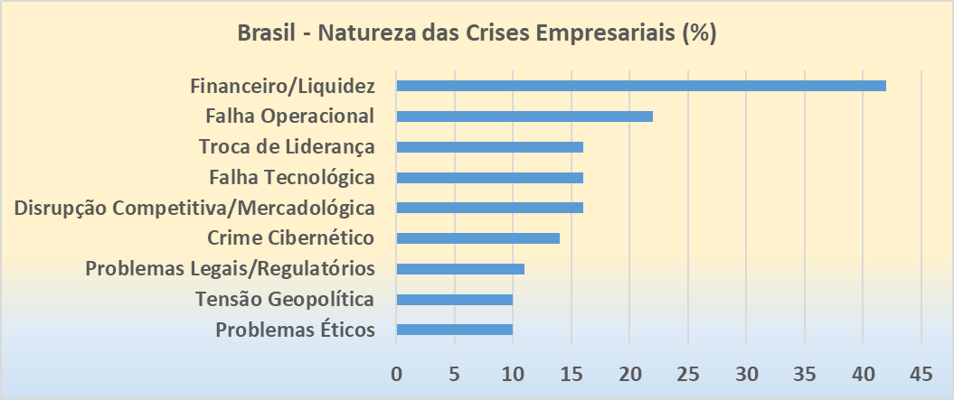 A pesquisa elencou 19 tipos de crises, das quais listamos a seguir as principais, no Brasil: