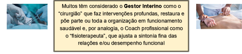 Concluindo, Gestão Interina e Coaching empresarial diferem na atividade profissional, mas a primeira apresenta pontos de contato com esta, durante a atuação na Empresa Cliente. Tipicamente, o Gestor Interino atua direta e rapidamente nos sistemas, processos e profissionais da Organização, estabelecendo objetivos e metas de curto e médio prazos. Age, portanto, diretamente nos resultados. O Coach profissional, por seu turno, é chamado a intervir no desenvolvimento de habilidades individuais e coletivas, na maior parte das vezes, relacionais, e de desempenho, mas sem atuar em processos e sistemas.